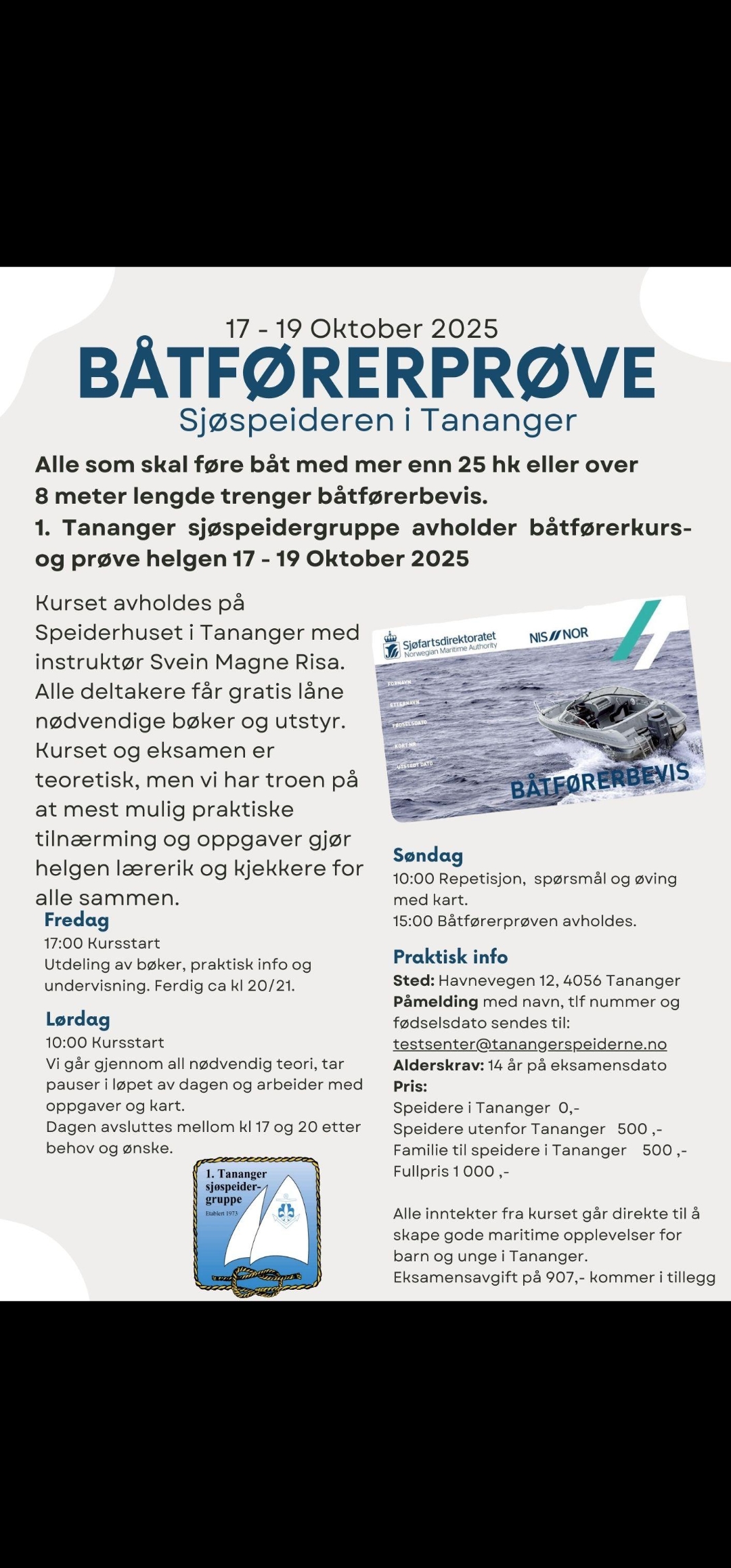 1.Tananger sjøspeidergruppe avholder båtførerkurs- og prøve.